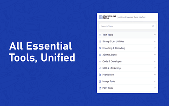 Stack Online Tools - Essential Tools, Unified är en gratis Chrome-tillägg som ger snabb åtkomst till över 30 olika onlineverktyg för utvecklare, marknadsförare och kreatörer. Programmet är uppdelat i tydliga kategorier, vilket gör det enkelt att hitta nödvändiga verktyg för textbearbetning, datavalidering och säkerhet. Verktygen inkluderar allt från JSON-formattering och konvertering till olika textverktyg som case-converters och URL-generatorer. Dessutom erbjuds användbara funktioner för bildkonvertering och generering av slumpmässiga namn och adresser.